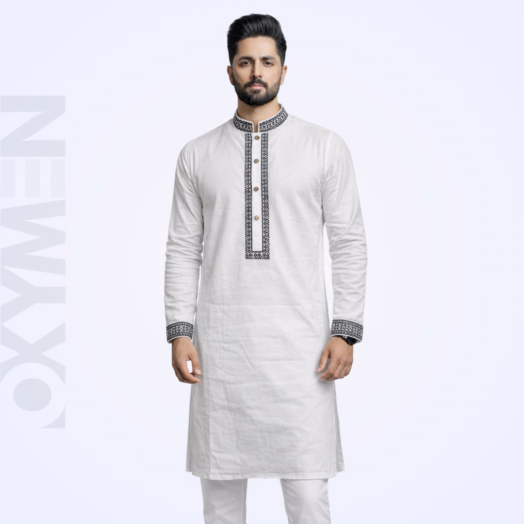 This Panjabi ensures all-day breathability and a soft, comfortable feel against the skin. The delicate classical embroidery on the band collar, placket, cuffs, and front panel adds a refined aesthetic, while the decorative buttons enhance its sophisticated appeal.